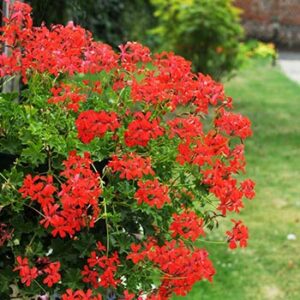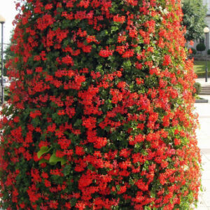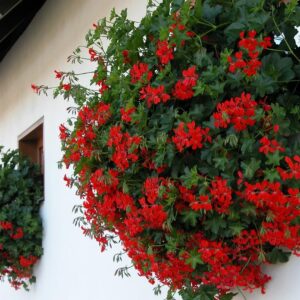 Pelargonia bluszczolistna o pojedynczych, czerwonych kwiatach, zwisającym pokroju, i dużej sile wzrostu. Atrakcyjna w skrzynkach balkonowych i wiszących koszach.